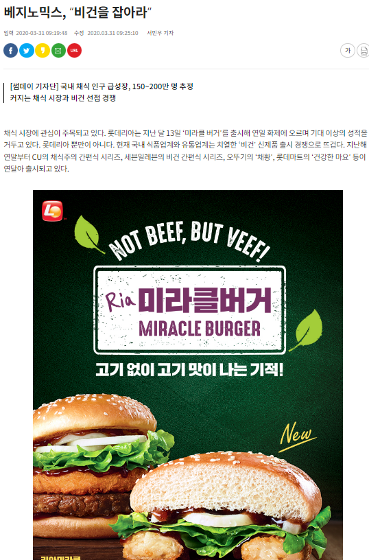 채식 시장에 관심이 주목되고 있다. 롯데리아는 지난 달 13일 ‘미라클 버거’를 출시해 연일 화제에 오르며 기대 이상의 성적을 거두고 있다. 롯데리아 뿐만이 아니다. 현재 국내 식품업계와 유통업계는 치열한 ‘비건’ 신제품 출시 경쟁으로 뜨겁다. 지난해 연말부터 CU의 채식주의 간편식 시리즈, 세븐일레븐의 비건 간편식 시리즈, 오뚜기의 ‘채황’, 롯데마트의 ‘건강한 마요’ 등이 연달아 출시되고 있다.