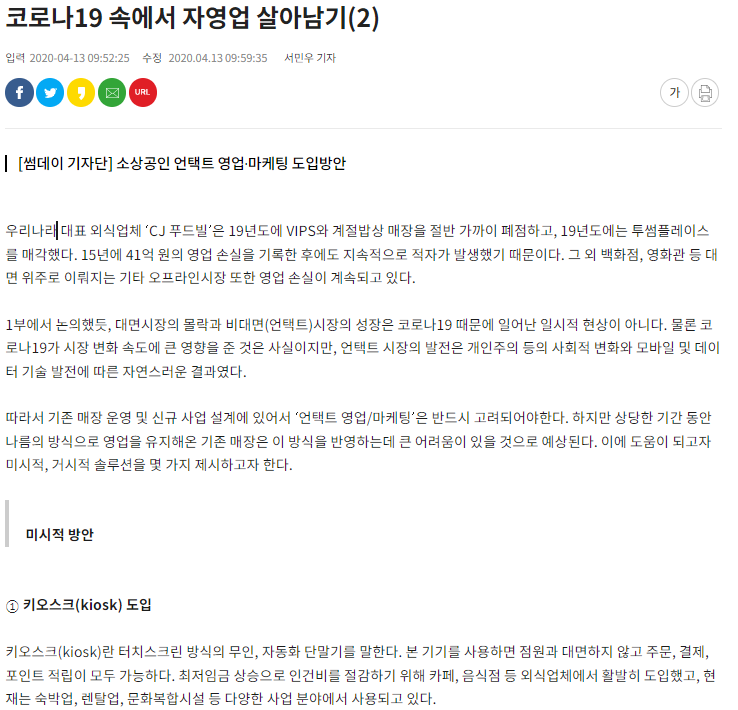 우리나라 대표 외식업체 ‘CJ 푸드빌’은 19년도에 VIPS와 계절밥상 매장을 절반 가까이 폐점하고, 19년도에는 투썸플레이스를 매각했다. 15년에 41억 원의 영업 손실을 기록한 후에도 지속적으로 적자가 발생했기 때문이다. 그 외 백화점, 영화관 등 대면 위주로 이뤄지는 기타 오프라인시장 또한 영업 손실이 계속되고 있다.